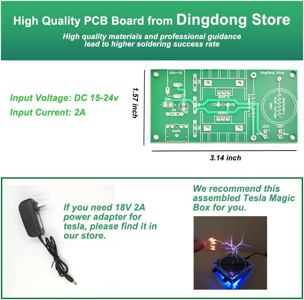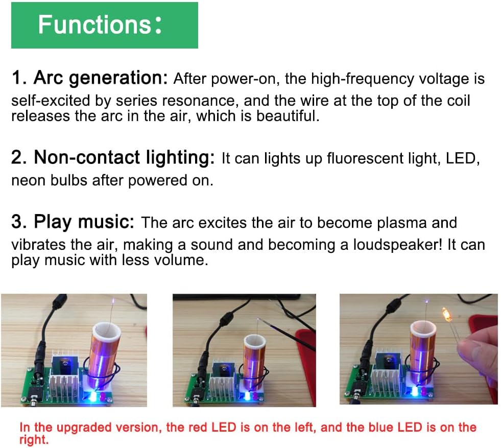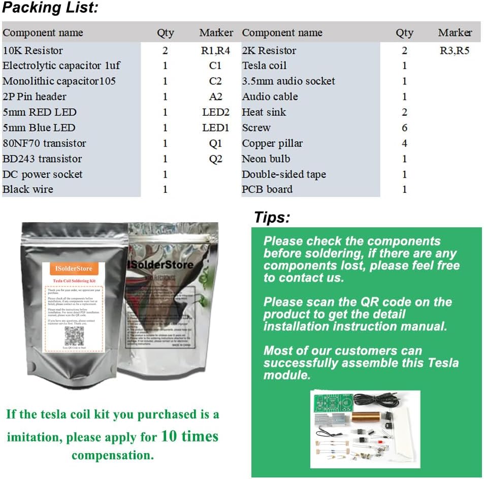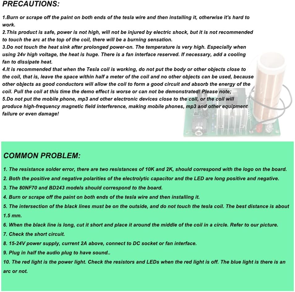 • 【Tesla Coil DIY Kit】: 15-24V DC input, After assembled, you will get a Tesla coil toy. You can observe Tesla phenomenon. It can produce electric arc, non-contact lighting, and even play music. The higher the voltage, the more obvious the effect. Note: Burn or scrape off the paint on both ends of the tesla wire and then soldering it, otherwise it’s hard to work.